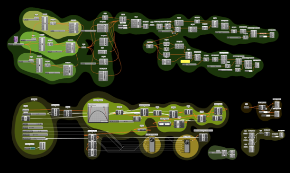 Figura 4. Captura de pantalla de programación nodal en Grasshopper aplicada al modelado tridimensional. [Archivo: Nicolás Robles P.]